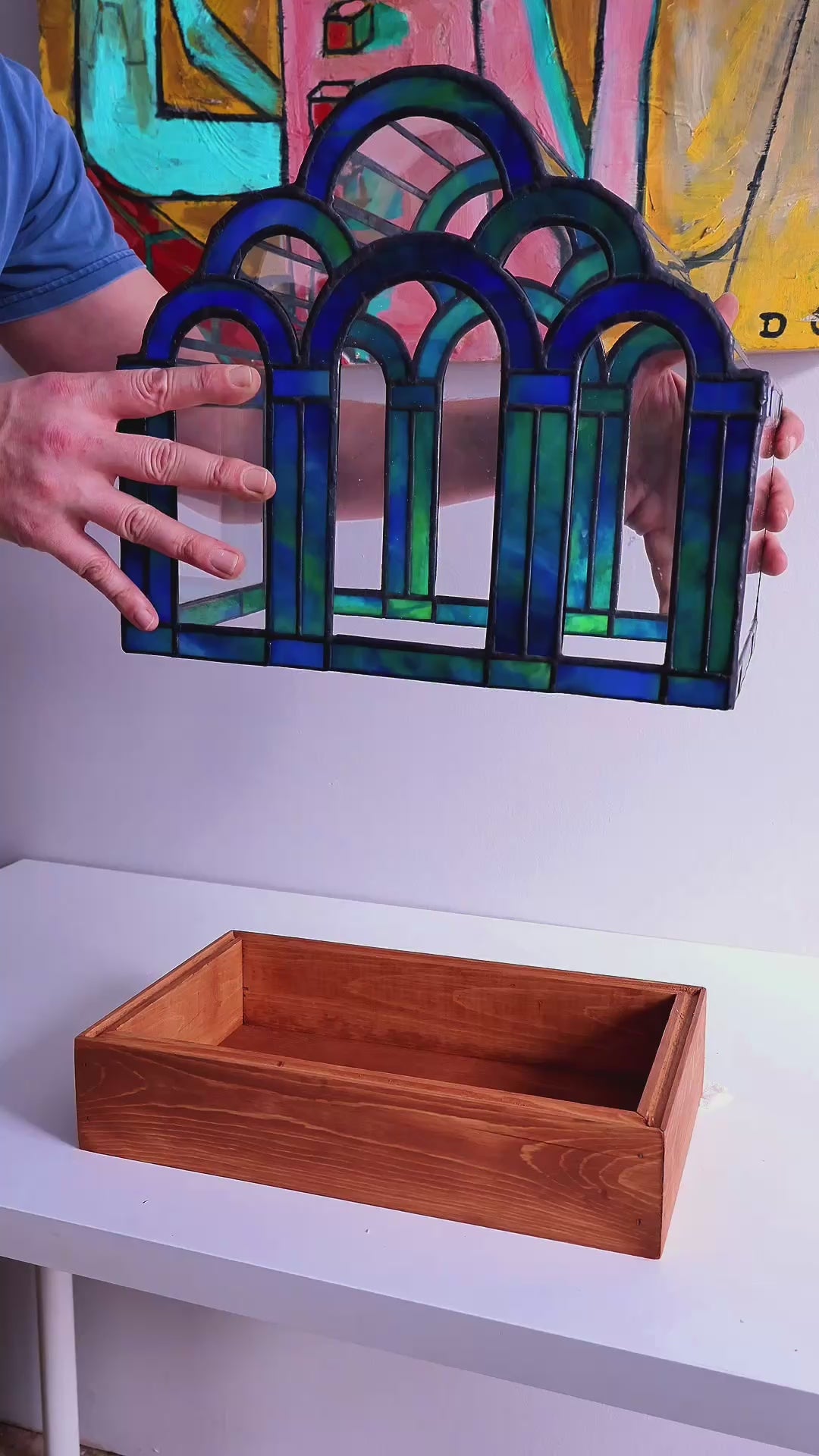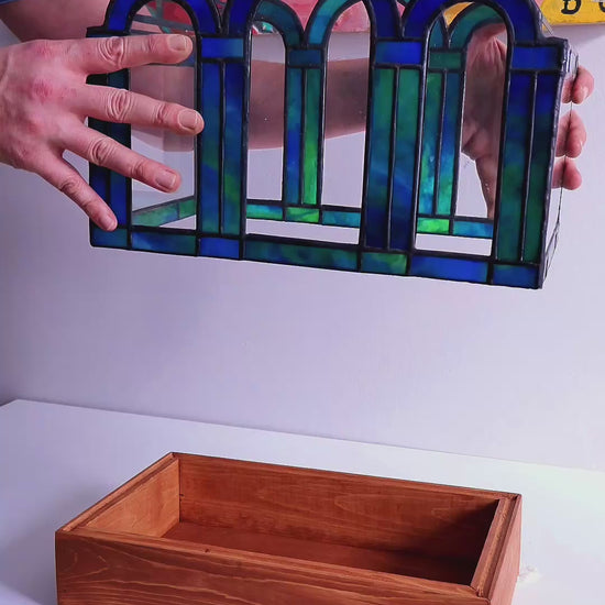 This limited edition design is modeled after classical garden temples. The dynamic top or “roof” is made of strips of slightly curved slump glass that follow the line of the arches. The front and black panel mirror each other in lush blue and green art glasses. The glass lifts easily out of a handmade wooden base that is routed to hold it in place. A fitting place display your favorite small plant collection or special curios.