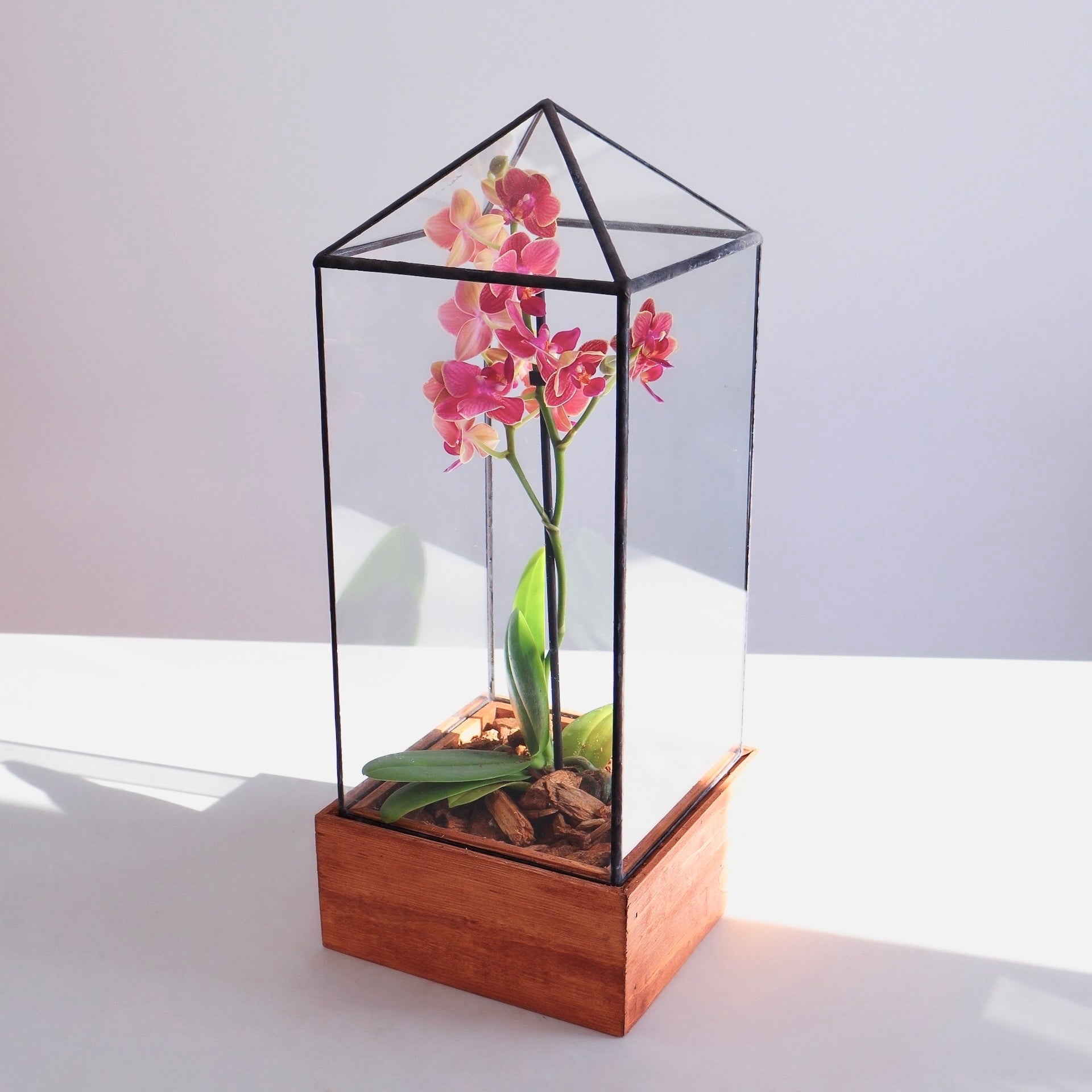 This Tower terrarium design offers plenty of height for the taller plants in your collection. With a clear simple line design and pyramid roof, it offers an unobstructed view for your favorite specimen.
