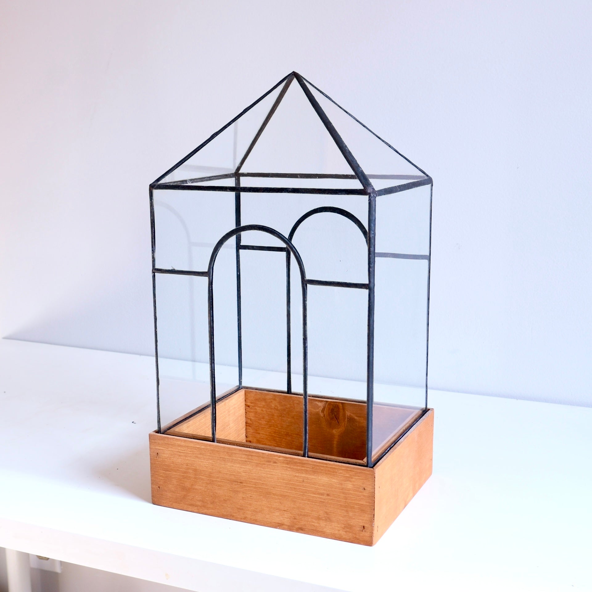 This terrarium draws inspiration from neoclassical architecture, aiming to evoke the grandeur of a classical temple to showcase your prized plants. The elegant curved arch is meticulously shaped through precise cutting and grinding of the glass, with each segment being expertly handcrafted following traditional stained glass methods. Its sloped roof design not only adds an aesthetic appeal but also accommodates taller plants.